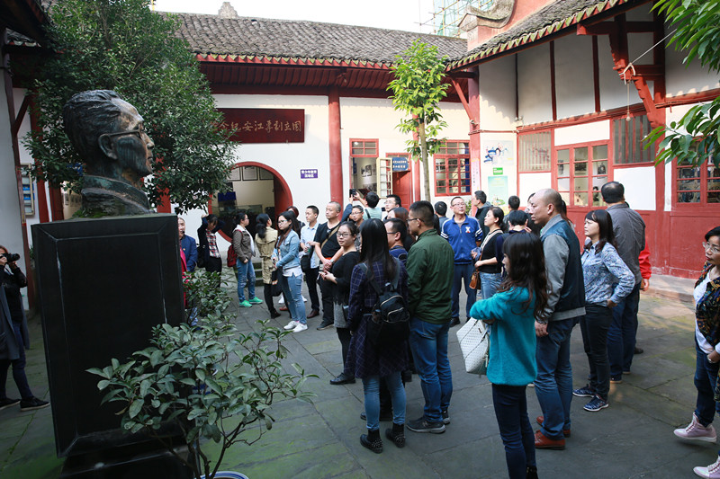 接着经济与管理学院教师一行到爱国主义教育基地——国立剧专陈列馆遗址参观学习,跟随着解说员的脚步,教师们参观了十个陈列室,了解了作为中央戏剧学院前身的国立戏剧专科学校的古往今来。重温了抗战文化,在抗战期间,这座学校搬迁到江安办学达六年之久,培养了曹禺、谢晋等享誉中外的艺术家,在中国戏剧史上留下了浓厚的一笔。解说员详细解说了国立剧专迁往江安6年的辉煌办学史,剧专师生们在六年里完成了《北京人》、《蜕变》、《正气歌》等上百部高水平、正能量的优秀文艺作品,在这座川南的小县城中掀起了一阵戏剧文化风潮,他们用戏剧作为武器,扛起了抗日救亡宣传的旗帜,为捍卫国家尊严和发动人民保家卫国做出了不可磨灭的贡献。通过参观,大家纷纷被大师云集的国立剧专深厚的文化底蕴、独特的文化魅力所深深折服!也让大家对抗战文化有了更深刻更贴切的认识,升华了爱国情感,陶冶了爱国情操!