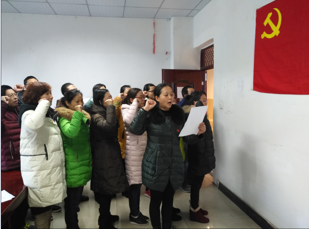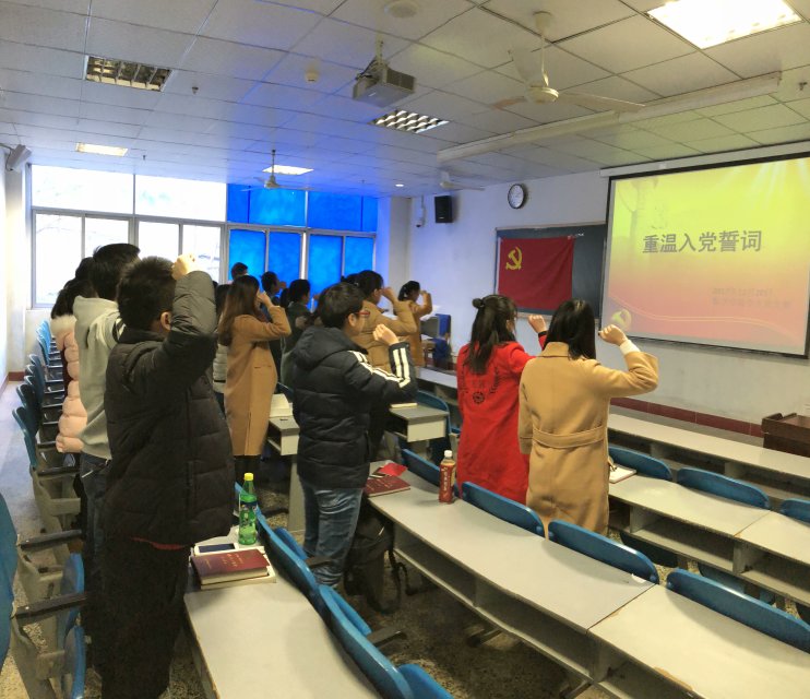 2017年12月20日下午3:00点数学学院学生党支部在三教503在支部书记魏贵玉、郭存存的带领下,全体党员面向党旗,以洪亮的声音,铿锵有力的再次宣誓,使每个共产党员不忘责任和使命,确保自己在思想上、行动上入党。
