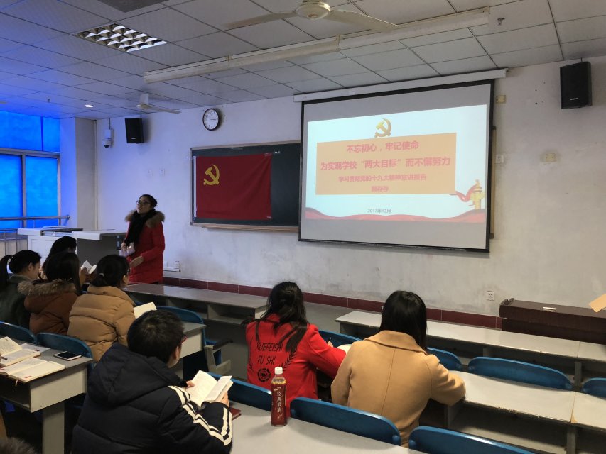2017年12月20日晚7:00点信息与计算科学与数学教育专业联合支部在三教504召开专题党课——学习十九大精神努力实现学校两大目标。让党员意识到十九大精神与每位党员息息相关,学校两大目标的实现关乎每位同学。