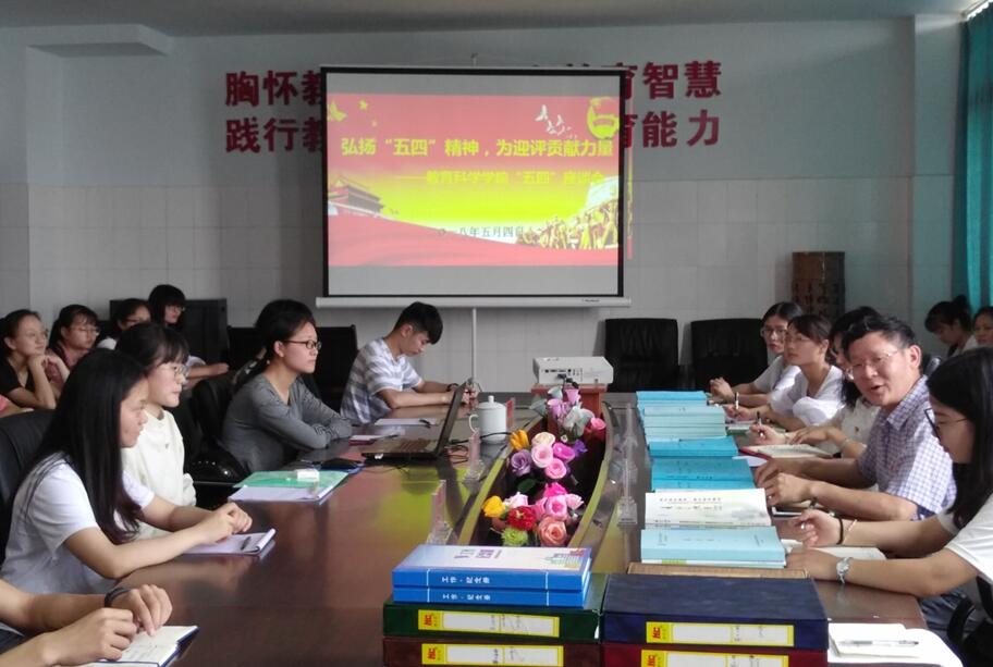 为弘扬“五四”精神,激励青年学生以积极状态迎接教育部本科教学评估工作,2018年5月4日中午,教育科学学院团总支在三平台艺术楼会议室召开“弘扬‘五四’精神,为迎评贡献力量”专题座谈会。党总支书记杨随军、团总支副书记郑春以及各班团员代表参加本次座谈会。会议由郑春主持。