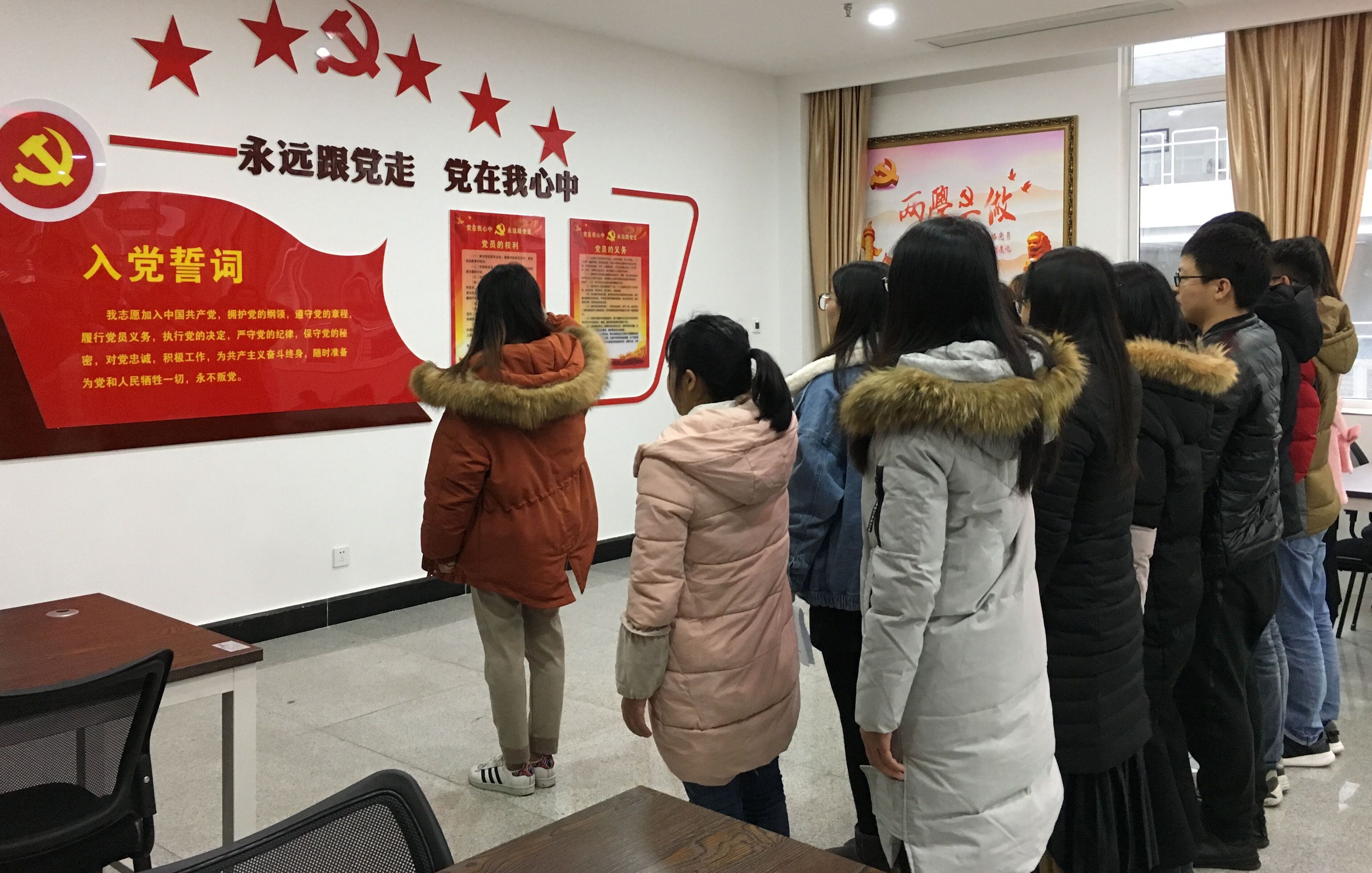 宣誓仪式过后,王玉平老师带领大家参观并且学习有关党务方面的书籍,大家互相交流学习,用实际的行动和表现来强化自己的诺言,通过政治理论和科学文化的学习来提高自身素质,通过与同学和睦相处与刻苦学习来建设校风学风。
