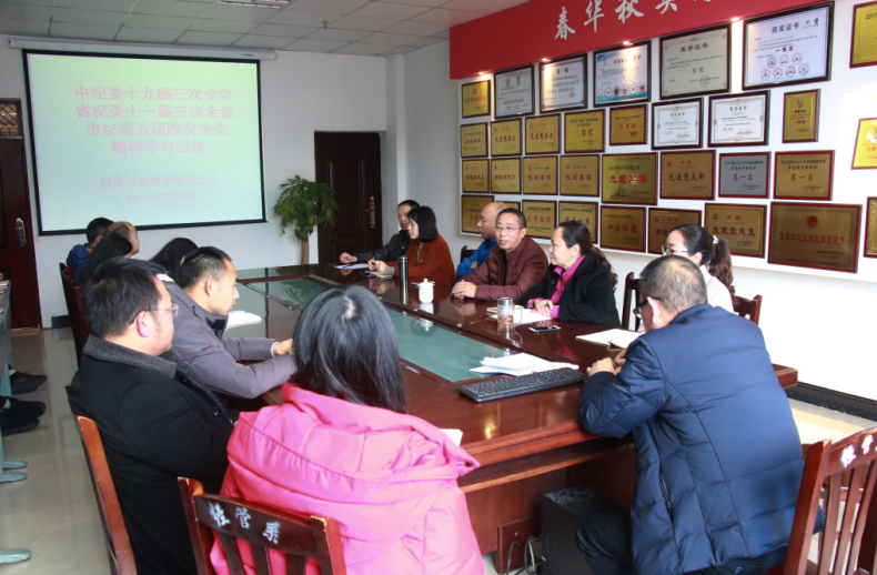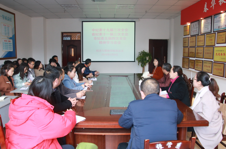 根据《中共宜宾学院纪委办公室关于认真学习贯彻中央、省、市纪委全会精神的通知》要求,深入学习贯彻中央、省、市纪委全会精神,扎实推进全面从严治党、党风廉政建设和反腐败斗争。3月6日下午,经济与管理学院党总支于硕勋楼的11楼经管学院会议室召开《中纪委十九届三次全会》《省纪委十一届三次全会》和《市纪委五届四次全会》精神专题学习会议。联系经管学院的学校纪委委员易炳平、经管学院党总支委员、处科级干部、8个师生党支部支委干部共计30余人参加此次会议,大会由经管学院党总支书记邹家敏主持。