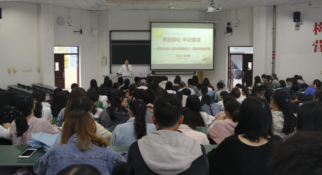 根据《中共宜宾学院委员会基层党支部开展“不忘初心、牢记使命”主题教育工作方案》要求,加强对经管学院师生党支部“不忘初心、牢记使命”主题教育的指导,激发师生党员的学习热情,2019年9月19日,经济与管理学院党总支组织200余名师生党员在硕勋楼B座201上“不忘初心、牢记使命”-庆祝中华人民共和国成立70周年专题党课,党课由经管学院党总支书记邹家敏主讲。
