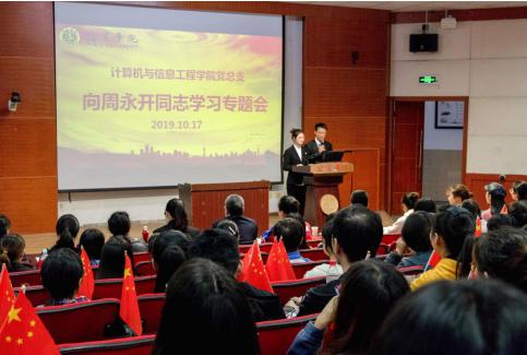 为了进一步提升“不忘初心、牢记使命”主题教育学习效果,激励广大党员同志把“为共产主义事业奋斗终生”作为一辈子的信仰和追求。10月17日中午,计算机与信息工程学院党总支在三教A101教室召开了“向周永开同志学习”专题会,计算机学院处科级领导干部,各支部党员和第11期发展对象培训班全体学员参加了此次学习会。