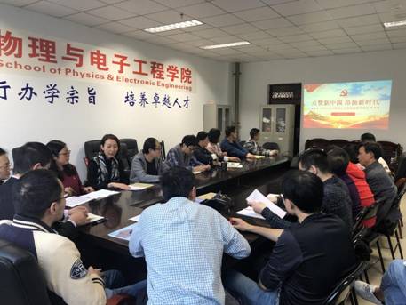 为深入推进物电学院“不忘初心、牢记使命”主题教育,值此新中国成立70周年之际,物电学院教师党支部于10月16日下午在三教十楼会议室,以“新中国70周年所取得的辉煌成就”为主要内容,给党员教师上了一次党课,对党员教师进行了一次爱党和爱国主义教育。