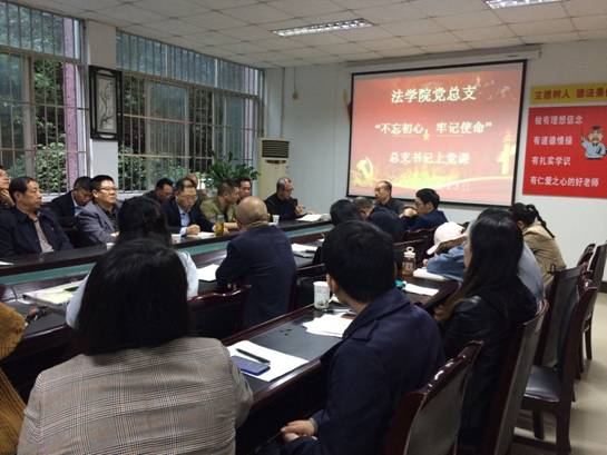 2019年10月23日下午,在初心楼法学院会议室,法学院党总支书记蒲东升以“坚守初心担使命,贯彻好第三次党代会精神”为题,为法学院教职工党员讲党课。学校“不忘初心、牢记使命”主题教育指导小组杨金云等六位同志莅临指导。