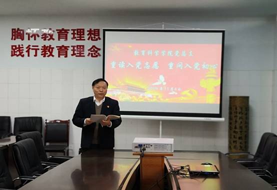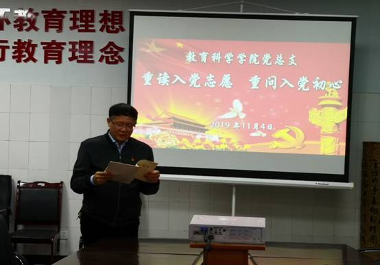 为切实增强党员领导干部宗旨意识、服务意识和担当作为意识,确保党员领导干部始终不忘初心、牢记使命,教科院党总支于2019年11月4日在学院党员活动室开展了“重读入党志愿、重问入党初心”活动。总支书记杨随军主持活动,处科级党员干部、总支班子成员参加活动。