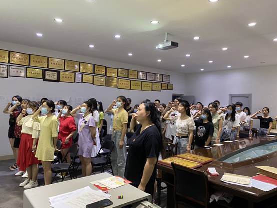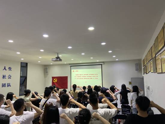 最后,张蕾老师带领各位毕业生党员重温入党誓词:与党员们以集体宣誓的方式,开展了一次重温入党誓词的活动。在鲜红的党旗下,全体党员举起右手、握紧拳头,庄严宣誓。通过重温入党誓词,让毕业生党员在党旗下接受心灵的净化和洗礼,感受来自党的正能量的熏陶,永葆共产党员的政治本色!