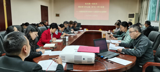 11月4日下午,机关第一党总支在办公楼五楼会议室召开中心组(扩大)学习会议,学习传达中国共产党十九届五中全会精神,一总支全体党员参加学习。
